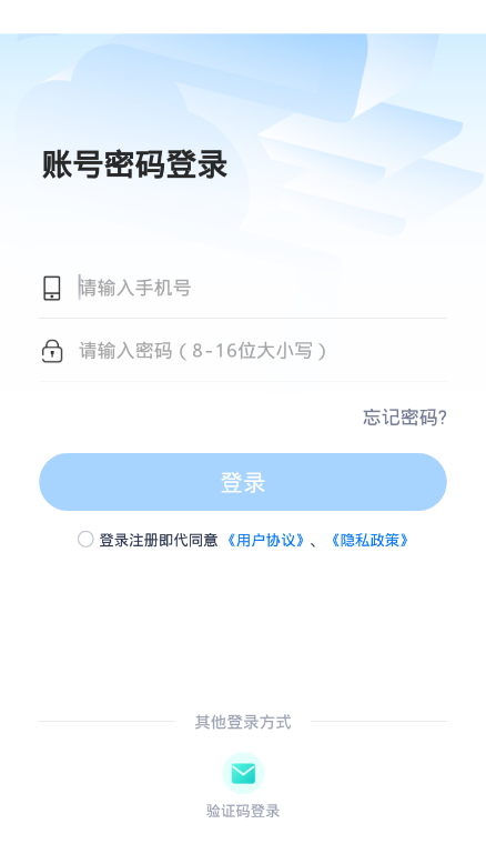 2、登入方式可以选择验证码登录或者密码登录。密码的设置在APP—我的——头像右侧—箭头—修改密码。系统采用银行级加密技术保障账号安全,支持指纹/面部识别快速登录。忘记密码时可通过绑定的手机号或邮箱快速找回,确保用户随时畅享云服务。