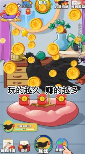这款游戏真实模拟了养殖八哥的全过程,玩家可以通过多种方式赚取红包奖励。游戏内设有不同品种的八哥,每种都有独特的成长路线和互动方式。玩家可以通过喂食、合成升级等简单操作来培养八哥,随着八哥等级的提升,系统会发放不同金额的红包奖励。游戏还设置了日常任务和成就系统,完成指定目标即可获得额外红包,让您在享受养成乐趣的同时获得实实在在的收益。