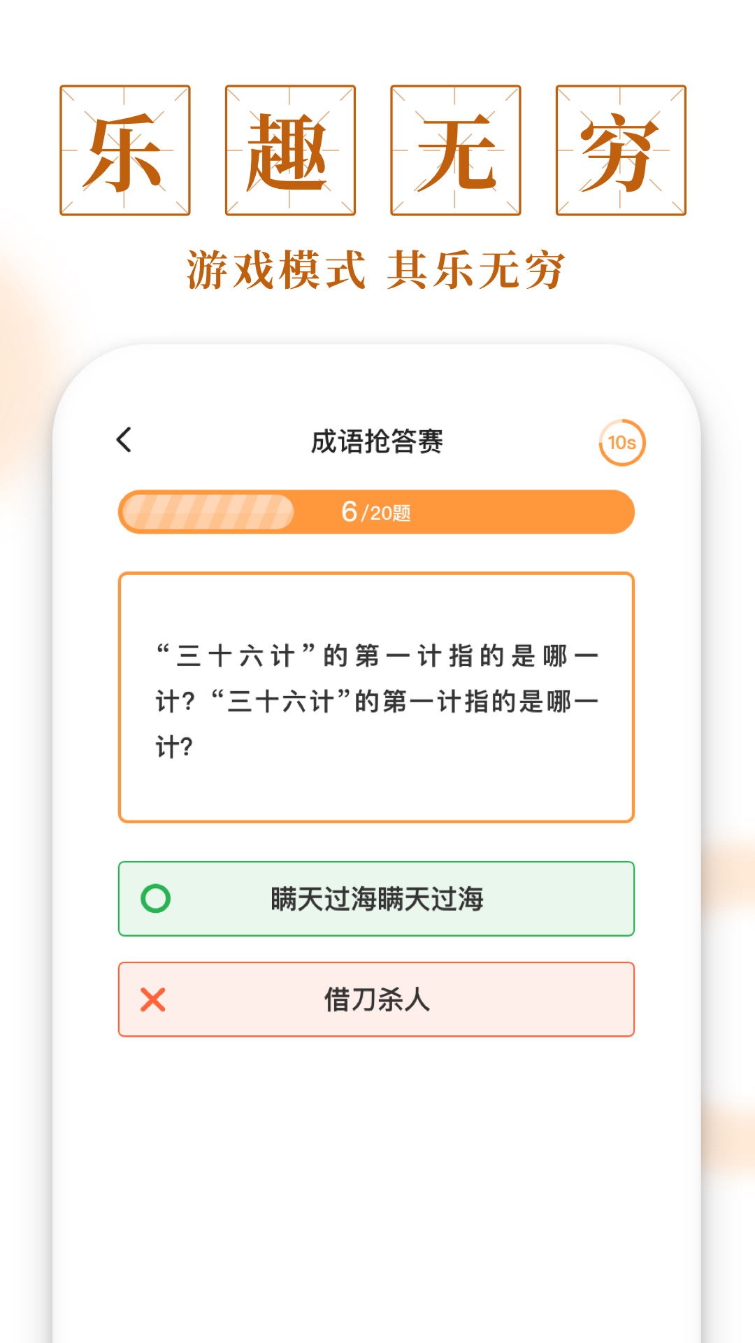 3.乐趣无穷,对于学习,很多朋友们都是感觉枯燥无味的,使用这款app,就有不一样的体验,在玩中学习,在玩中轻松掌握知识。多位教育专家评测认为,这款app成功打破了传统语文学习的枯燥模式,开创了数字化成语教学的新范式。