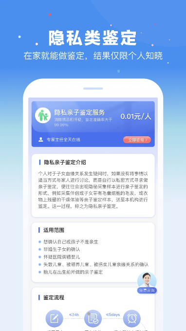 百分鉴定app是一款专业可靠的亲子鉴定服务平台,致力于为用户提供权威、便捷的亲子关系鉴定解决方案。平台整合了全国数百家具备司法鉴定资质的专业机构,通过智能化的在线服务系统,让用户足不出户即可完成从咨询、预约到获取鉴定报告的全流程。无论是个人隐私需求还是司法用途,平台都能提供具有法律效力的鉴定结果,并配备专业的法律顾问团队全程指导。我们采用国际领先的DNA检测技术,确保鉴定准确率高达99.99%,同时严格保护用户隐私,所有数据均通过加密传输和存储。