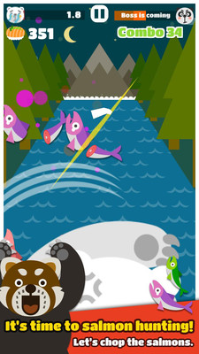 玩家看到抛出的鱼类在屏幕上移动划过去,就可以像武林高手一样痛快地斩开鲑鱼了,在它们掉落之前要快速地全部砍掉;游戏采用触屏操作方式,只需用手指在屏幕上滑动即可完成切割动作。不过除了很多被抛出的鱼类外,也会出现混杂着炸弹、毒瓶一类的东西,一旦切到就会引发爆炸;这些危险物品会随机出现,增加了游戏的刺激性和挑战性。获得高分数有体力有限尽可能多的鱼和大熊。在有限的精力中捕捉尽可能多的鱼熊获得了很高分数。游戏还设置了多种特殊道具和奖励机制,让玩家在挑战高分的同时享受更多乐趣。