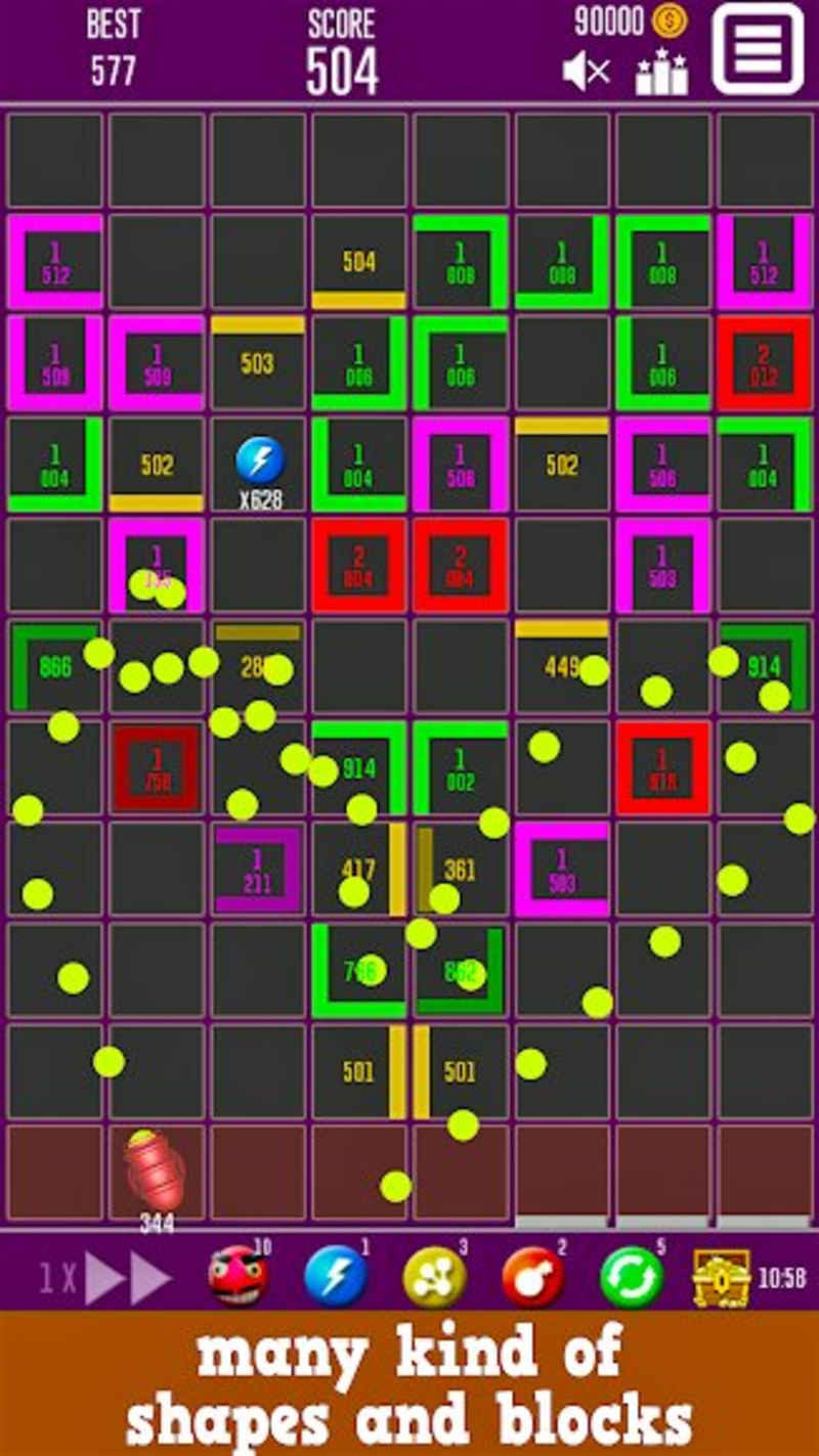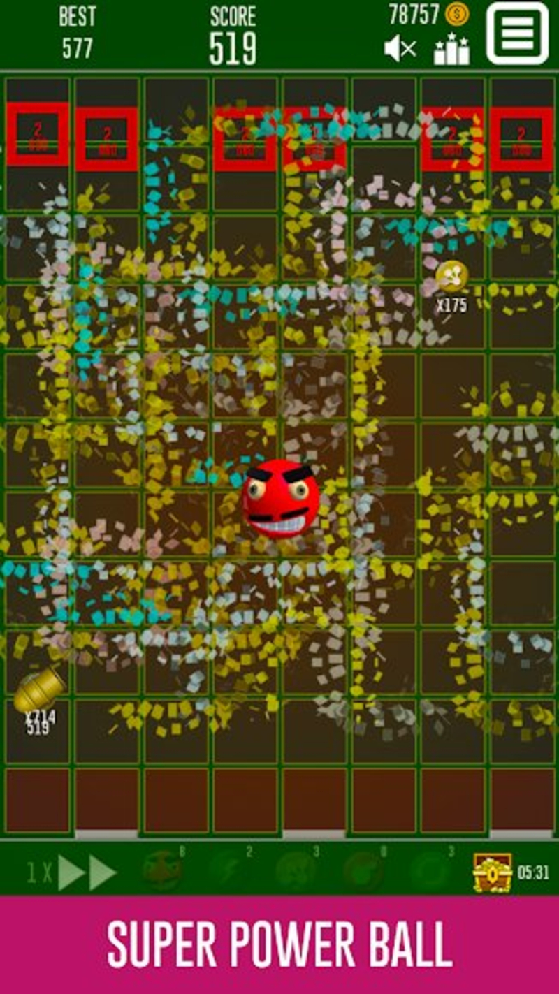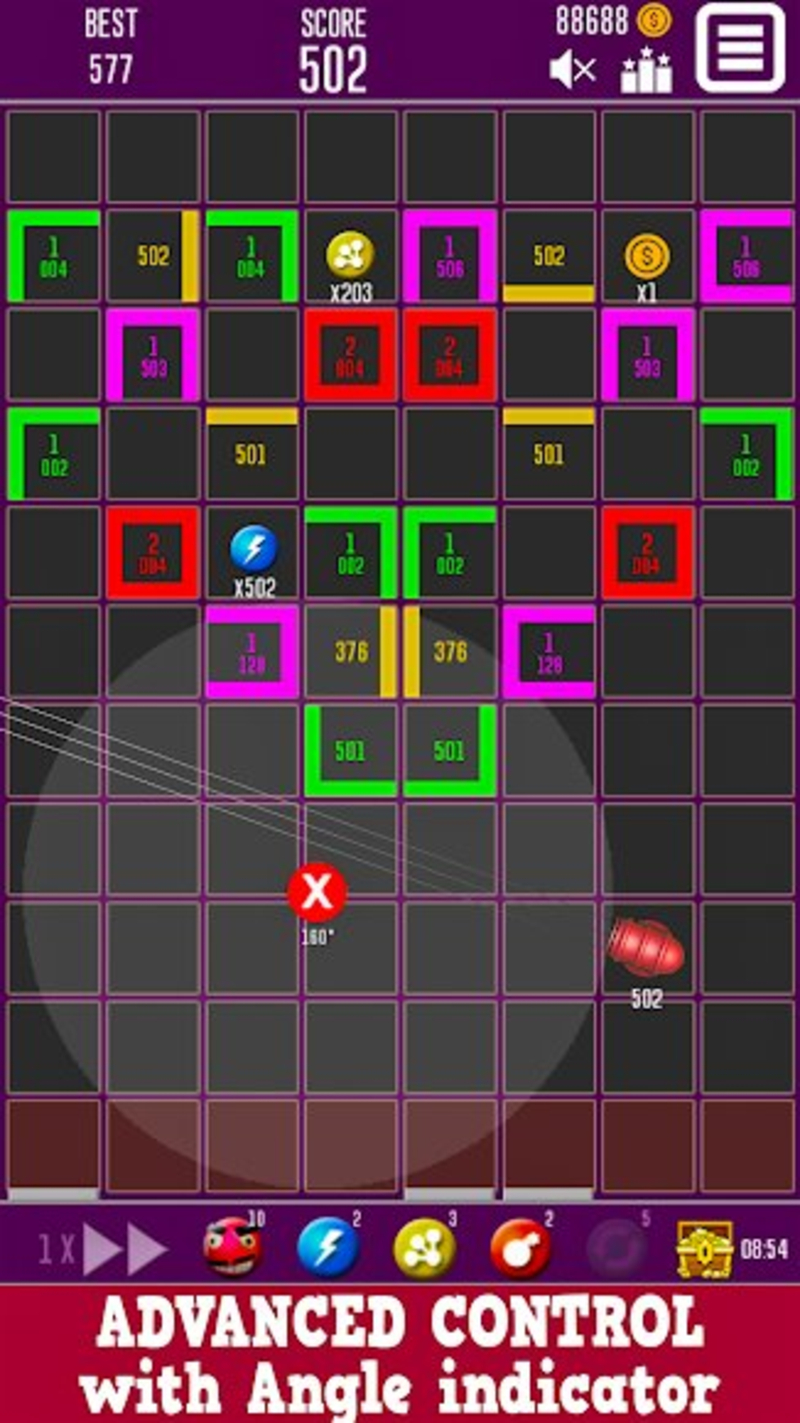 游戏采用直观的触控操作,只需轻触屏幕发射小球,并通过滑动来控制发射方向。游戏提供了多样化的游戏元素,包括6种特色各异的砖块类型(单块、L块、U块、方块、六角块等)和4种不同射速的发射器,玩家可以在商店菜单中查看详细属性。丰富的道具系统是游戏的一大亮点,包含加速按钮、风暴道具、多重道具和炸弹道具等。特别设计的宝箱系统每30分钟就会开启一次,为玩家提供惊喜奖励。通过击碎砖块可以获得金币,这些金币可以用来解锁更多强力道具和特殊球体,大大提升了游戏的可玩性和策略深度。