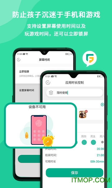 屏幕时间,应用时长控制:支持分时段设置不同的使用时长限制,可针对特定应用设置独立使用时间,当达到设定阈值时自动锁定屏幕,并发送提醒通知到家长端。