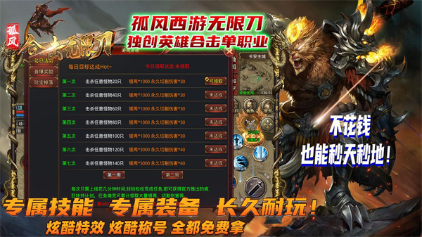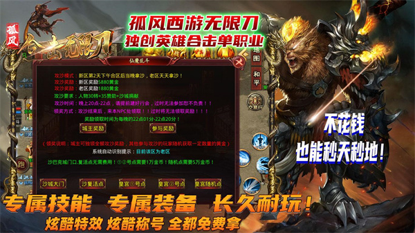 孤风合击无限刀是一款深受玩家喜爱的经典传奇类手游,完美复刻了传奇游戏的经典玩法与热血情怀。游戏不仅保留了传奇系列的核心特色,还加入了诸多创新元素,为玩家带来既熟悉又新鲜的游戏体验。在这里,你可以体验到丰富多样的副本挑战、酣畅淋漓的PVP对战,以及令人惊喜的超高爆装率,让每一次冒险都充满期待与惊喜。