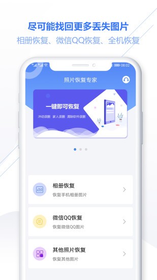 相册恢复、微信QQ恢复、全机恢复,最大限度找回丢失的图片:支持从20多个数据源恢复照片,包括系统相册、微信相册、QQ缓存等。