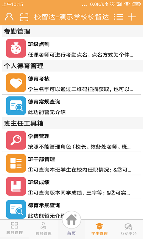 校智达软件是基础教育的管理软件,为中学、小学、职校的管理服务,包含:校务管理、学生管理和教学管理等内容,同时实现学校与家庭的互动管理。平台采用先进的技术架构,确保系统运行的稳定性和安全性。