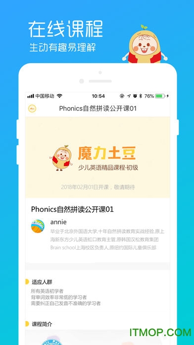 魔力土豆手机客户端是一款专为儿童英语启蒙打造的互动学习应用。通过生动有趣的动画课程和互动游戏,帮助孩子在轻松愉快的氛围中掌握英语基础知识。应用采用情景式教学法,以主角魔力土豆的日常生活冒险为主线,将英语学习融入真实场景。课程内容涵盖单词记忆、语法学习、自然拼读等多个方面,适合不同英语水平的儿童使用。专业的教学设计和优质的绘本资源,让您的孩子在快乐学习中快速提升英语能力。