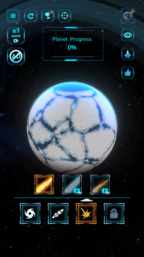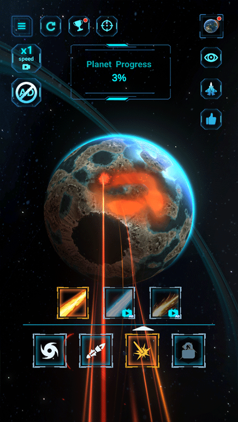 初次进入游戏时,建议先选择planet模式开始体验。游戏界面设计简洁明了,底部工具栏提供了各种破坏性武器。玩家可以通过滑动屏幕来调整视角,全方位观察行星的状态。使用激光武器时要注意能量消耗,合理搭配不同武器能更快达成目标。当破坏进度达到100%时,就能解锁新的行星和关卡。随着游戏进程的推进,还会解锁战机模式等更多精彩内容。