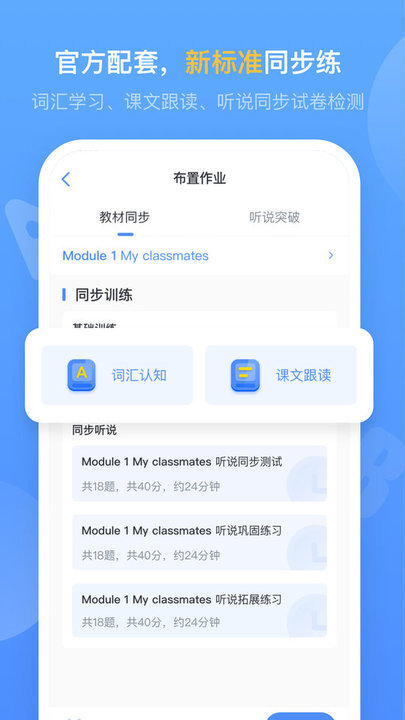 听、说、读、写四种能力支持听读、选择、填空、连线等二十多种趣味题型。题型设计遵循语言习得规律,从输入到输出形成完整闭环。系统自动生成并可一键推送给孩子们,让孩子们能够及时的进行强化巩固,不会读的词汇,练到会。智能算法会识别学生的薄弱环节,自动推送针对性练习。在语音作业模块,APP中智能思维训练系统给到孩子的是因素、词汇、句型、语篇、语法等知识点的全面覆盖。每个知识点都配有详细的讲解视频和互动练习。深知听力口语能力之于学好英语这门语言的重要性,因而在保证孩子们应试能力的基础上,本款APP将会是孩子们听说学习的绝佳平台。创新的语音识别技术能准确评估发音质量,提供即时反馈。