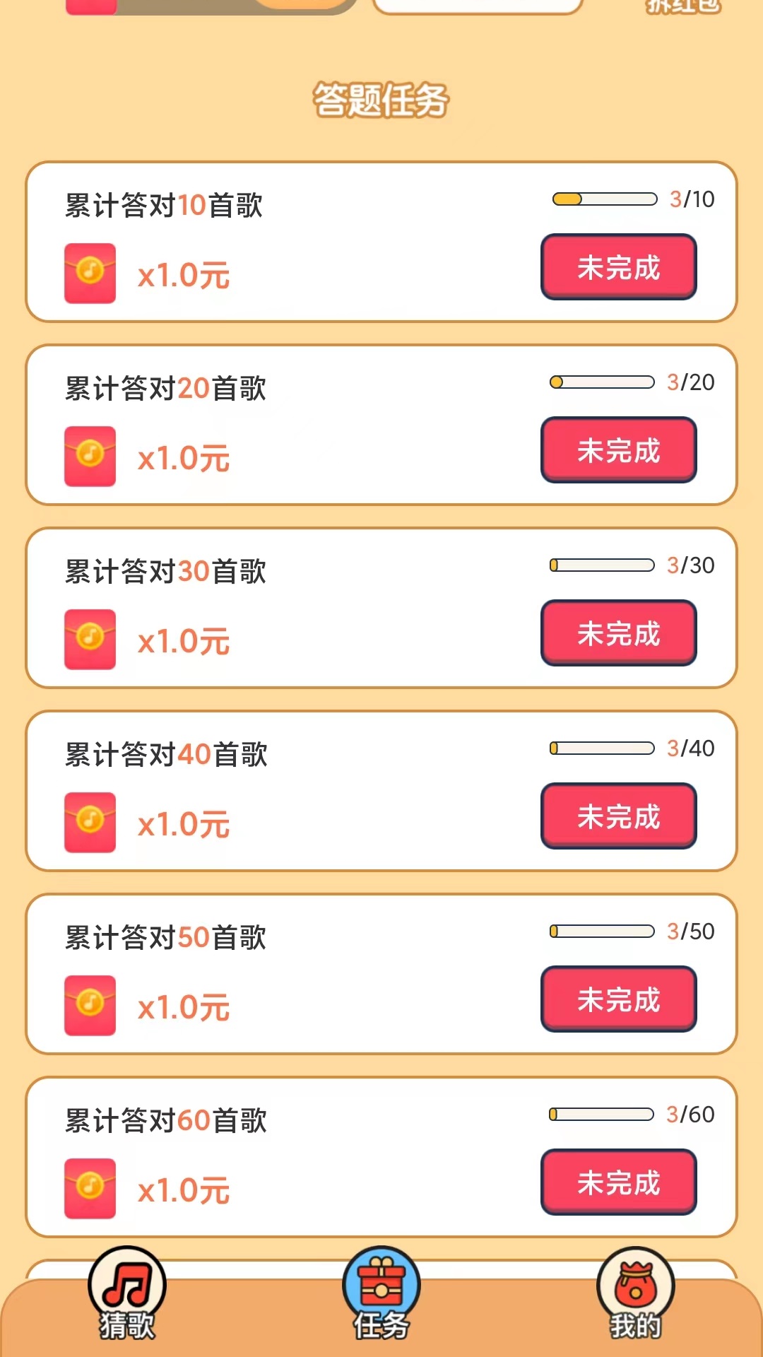海量曲库等你体验,通过听音乐识别曲目,然后也是可以让你通过正确答案来获取奖励;曲库会定期更新,保持内容新鲜度。用户可以通过猜歌获得收益,让你每天不仅可以在这里寻找更多的欢乐,还会让你赚钱的;游戏将娱乐与收益完美结合。为广大用户带来最新的音乐玩法,时下最火最时尚的猜歌游戏,完成猜歌还有收益;紧跟音乐潮流趋势。玩家可以在听音乐的同时享受猜谜的乐趣,随时随地即可让你来感受更多的游戏欢乐世界;支持离线模式,没有网络也能玩。