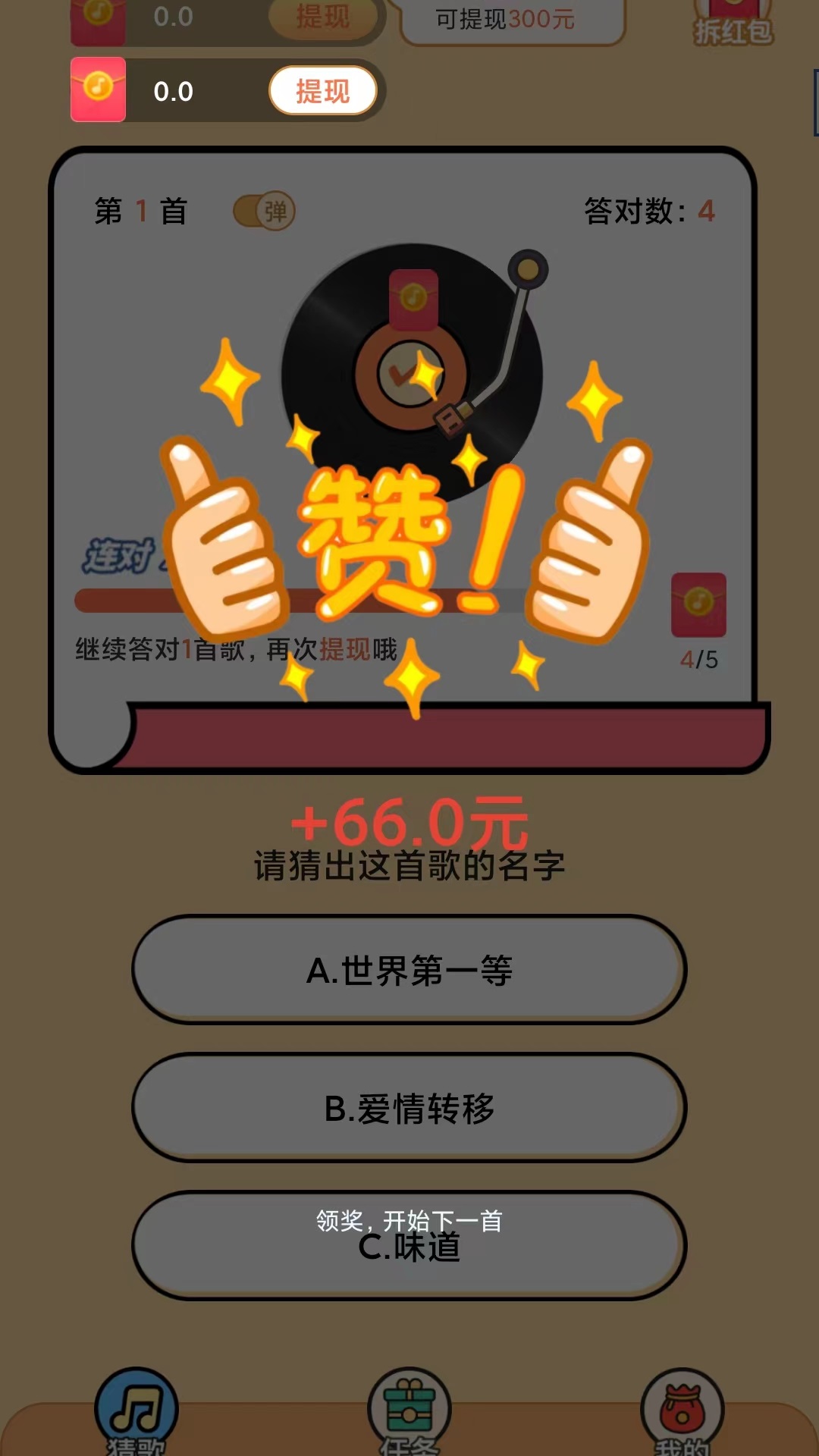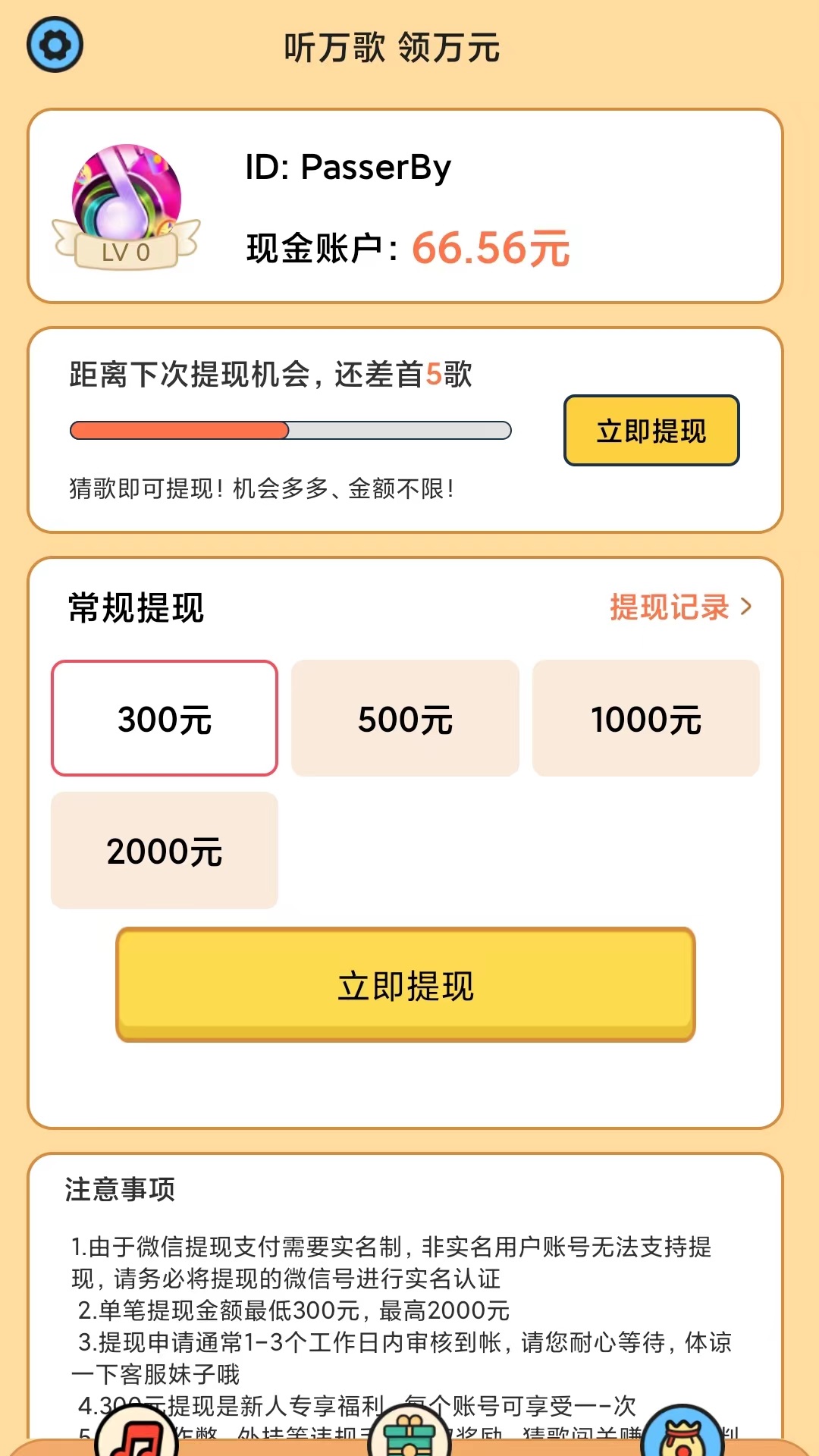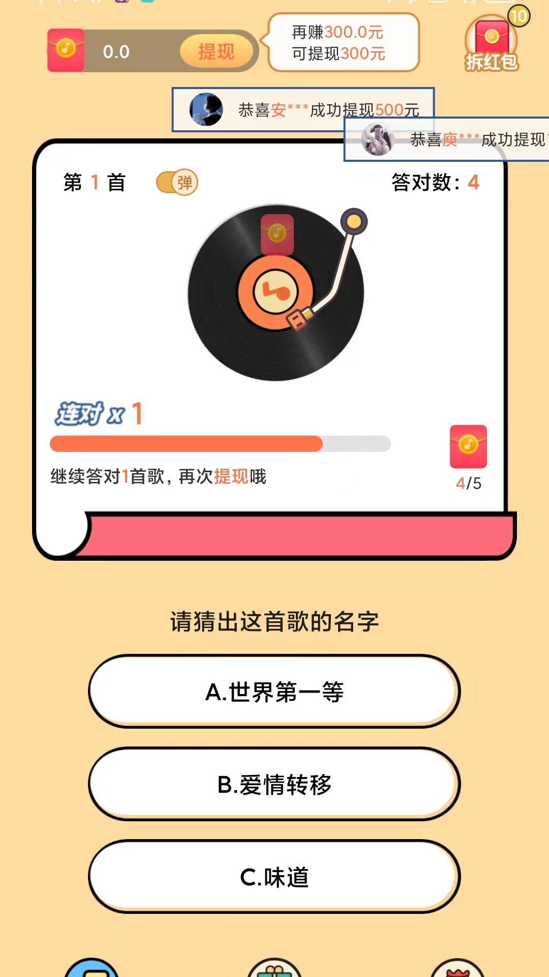 猜歌挑战等你来挑战,每一题都会给出不完整的歌曲片段,你需要根据提示猜出正确答案。如果你平时听歌较多,就能轻松答对更多题目,答对的关卡越多,获得的红包奖励也越丰厚!游戏中的歌曲库不断更新,从经典老歌到时下流行音乐应有尽有,让你在享受音乐的同时还能赚钱。不过要注意的是,随着关卡推进,歌曲会变得越来越小众,挑战难度也会逐渐增加。