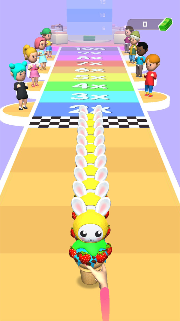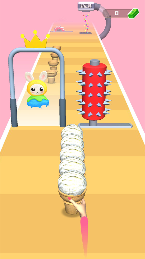 游戏最大的亮点在于其独特的玩法设计。在色彩缤纷的赛道上,玩家需要一边奔跑一边收集甜筒和原料,同时还要注意避开各种障碍物。收集的原料越多,制作出的雪糕就越丰富,获得的收益也就越高。游戏还加入了经营元素,你可以在赛道上设立临时摊位,将制作好的雪糕卖给路过的顾客,赚取额外金币。但要注意,赛道上还隐藏着各种陷阱和竞争对手,需要你灵活应对。简单直观的操作方式让玩家可以轻松上手,而丰富的游戏内容又能带来持久的乐趣。