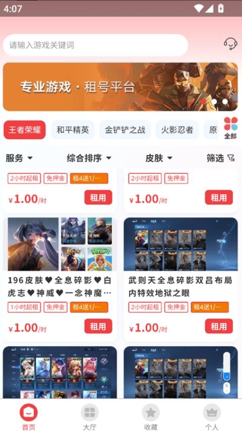 平台拥有专属的租号大厅,汇集了海量经过严格筛选的游戏账号资源。用户可以根据游戏类型、段位等级、皮肤数量等条件进行精准筛选,快速找到心仪的游戏账号。无论是想体验高端账号的畅快感,还是寻找性价比高的普通账号,九租号都能满足您的需求。特别值得一提的是,平台还设有超值的一元专区,让用户能够以极低的价格租赁到大神级别的游戏账号,享受前所未有的游戏体验。