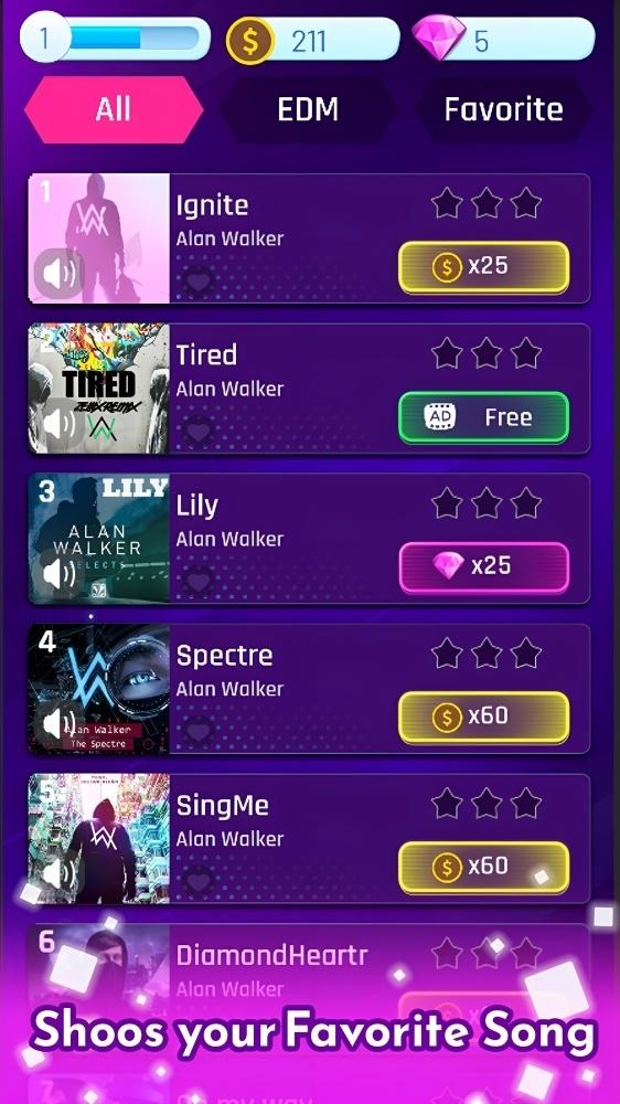 游戏收录了海量热门金曲,包括Alan Walker等国际知名音乐人的代表作。最新版本特别优化了歌曲库分类系统,让您能快速找到心仪的曲目。每首歌曲都经过专业音效团队精心调校,确保游戏中的每个音符都能完美还原原曲魅力。此外,游戏还定期更新限时活动曲目和主题皮肤,让您的音乐之旅始终保持新鲜感。