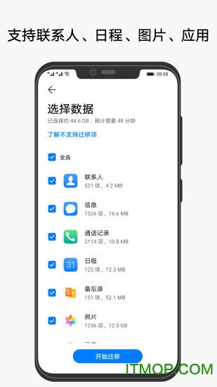 在旧手机上勾选需要传输的数据类型,支持单选或多选模式。确认选择后点击【开始迁移】按钮,系统会自动将选定内容传输到新设备。传输过程中会实时显示进度条和预估剩余时间,迁移完成后会有明确提示,用户可以立即在新设备上使用这些数据。