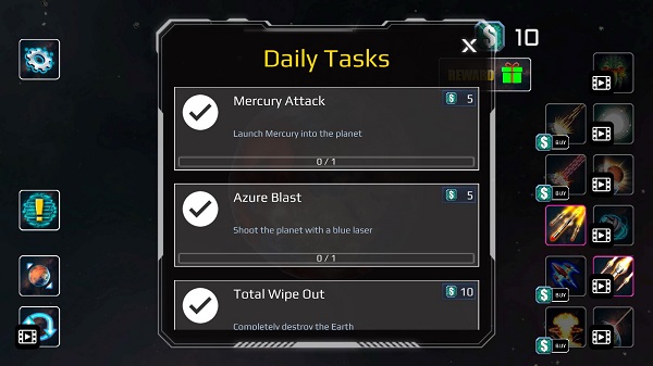 游戏操作简单直观,通过右侧武器面板选择破坏工具后,只需点击行星表面即可发动攻击。玩家可以自由调整摄像机角度和缩放级别,从各个角度欣赏毁灭过程。完成特定破坏任务可获得成就奖励,积累的积分可用于解锁隐藏武器和特殊行星。游戏还支持场景重置功能,让玩家可以反复尝试不同的破坏组合,创造出独一无二的宇宙灾难场景。