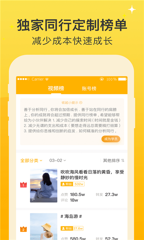 「专属客服」每位学员都可获得专属运营顾问,提供从课程学习到账号运营的全周期指导。平台签约的50+行业导师,均具有百万粉丝账号运营经验,可针对性地解决学员遇到的各种难题。