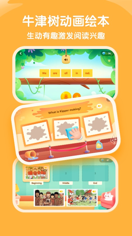 进阶学习:寓读于乐。提供牛津阅读树全系列双语精讲绘本故事。这些跨领域、多元化的绘本内容不仅幽默有趣,还通过游戏化的互动场景设计,让孩子在循序渐进的学习过程中保持兴趣和动力。