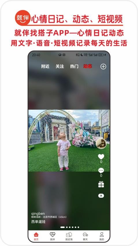 用户可以浏览附近用户的图文动态,通过点赞、评论、关注等方式进行互动。