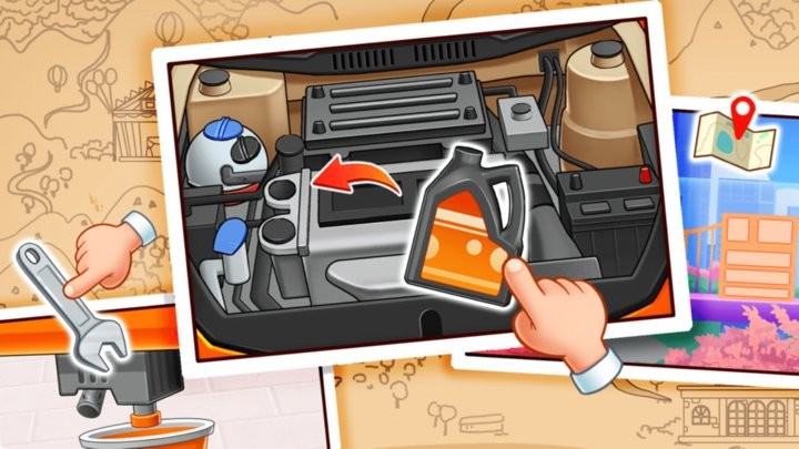 汽车修理:修复车辆划痕、更换破碎玻璃、更换机油、修理底座等保养,提供多种便捷工具,使用螺丝刀卸下螺丝,更换新轮胎,使车辆达到最好的结果。修理系统包含数十种常见故障类型,每种都需要采用特定的维修方法。