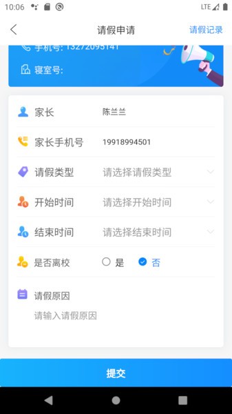 请假管理功能也十分便捷。家长可以直接在app上为孩子提交请假申请,只需填写请假类型、起止时间等基本信息,就能快速完成申请流程。所有请假记录都会完整保存在系统中,家长可以随时查看历史记录,了解孩子的请假情况。