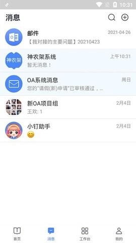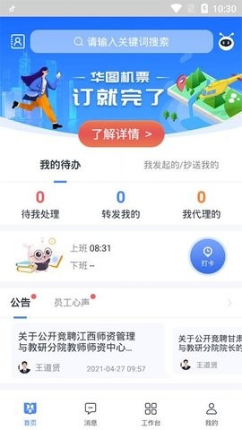 下载该软件后,用户需要注册账号并进行登录使用,确保账号信息安全;进入首页,可以查看待办事项、公告、员工心声、上下班打卡等功能,快速了解工作状态;进入工作台中,可以选择快捷通道、人事服务、教务管理等功能进行编辑,打造个性化工作界面;在消息页面,用户可以查看邮件消息、系统消息、群组消息和私聊消息,实现全方位沟通;进入我的页面后,就可以编辑个人信息,管理账号信息和设置功能,完善个人资料。