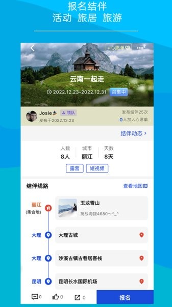 结伴流动养老平台-快乐鸟。通过平台找到志趣相投的人,不同的季节,自由选择合适旅居驻点,异地常住,短住,一边旅游一边养老。自主发起流动线路,发布心愿,让更多的人组织活动,群聊、私聊沟通极为方便。时间自主性强,旅游元素相对丰富,满足中老年人精神需要,让结伴更简单。
