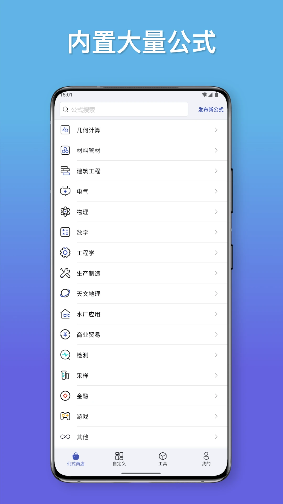 公式计算器是一款功能强大的计算工具,内置了海量实用的计算公式,涵盖数学、物理、化学、工程等多个领域。用户只需输入相关数值,即可快速获得计算结果,大大简化了复杂的运算过程。除了使用预设公式外,用户还可以根据个人需求创建专属的自定义公式,灵活满足各种特殊场景的计算要求。自定义公式一旦创建完成,后续使用时只需输入参数就能立即得出结果,显著提升了工作效率。