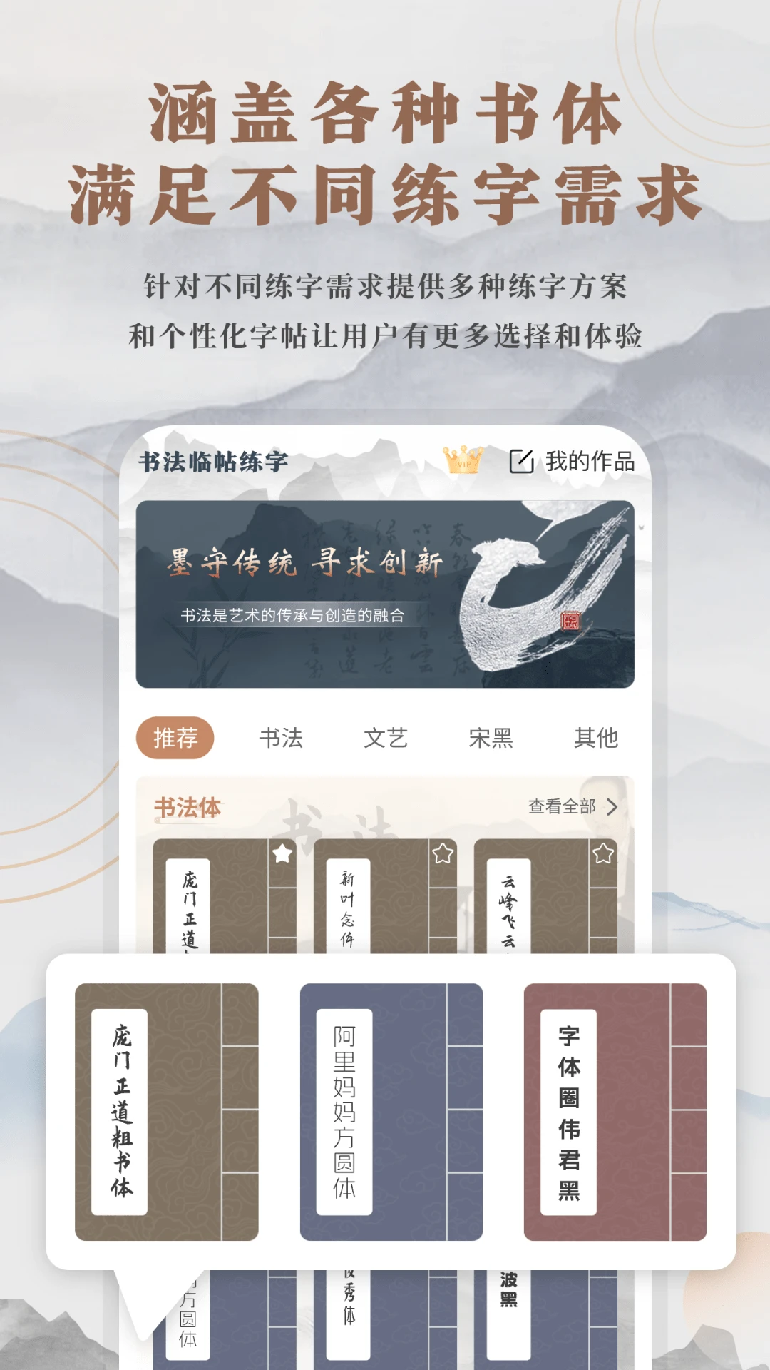 软件内置丰富的字体资源库,包含楷书、行书、隶书、草书等主流书法字体,均可免费下载使用。每种字体都提供详细的书写示范和笔画分解,方便用户系统学习不同字体的特点。用户还可以将下载的字体应用到日常练习中,通过对比不同字体的风格差异,深入理解书法艺术的多样性。定期更新的字体库确保用户总能接触到最新的书法资源,保持学习的新鲜感和持续性。