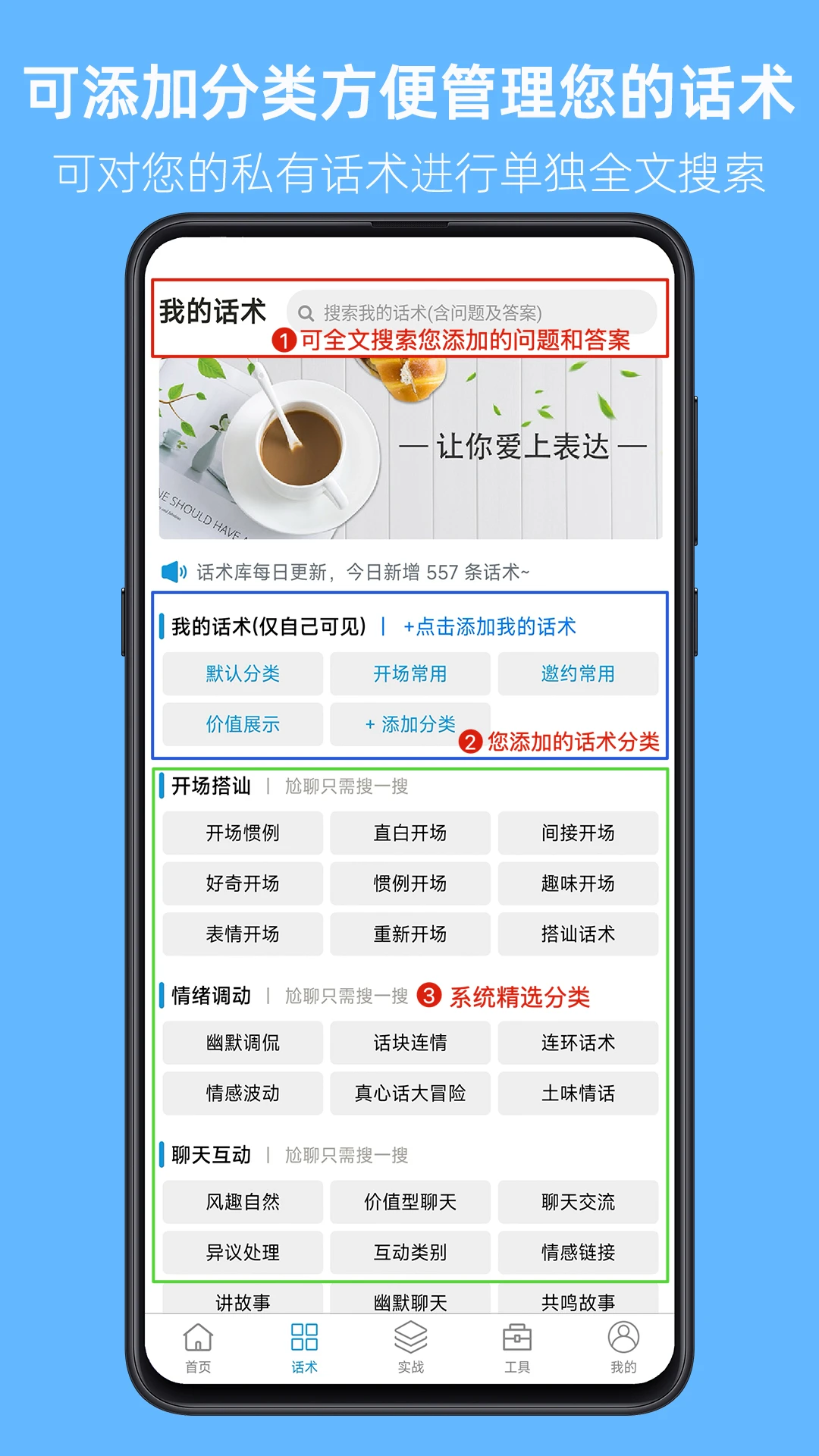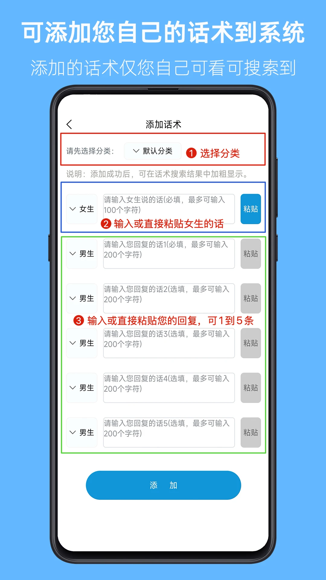 其次是强大的自定义话术库功能,遇到让你拍案叫绝的绝妙回复?直接粘贴保存到仅自己可见的私有库中!通过智能分类管理和全文搜索功能,即使你只记得半句话,也能快速检索出来。这个功能让你可以轻松打造属于自己的专属聊天套路,在各种社交场合都能游刃有余,牢牢掌握对话主动权。