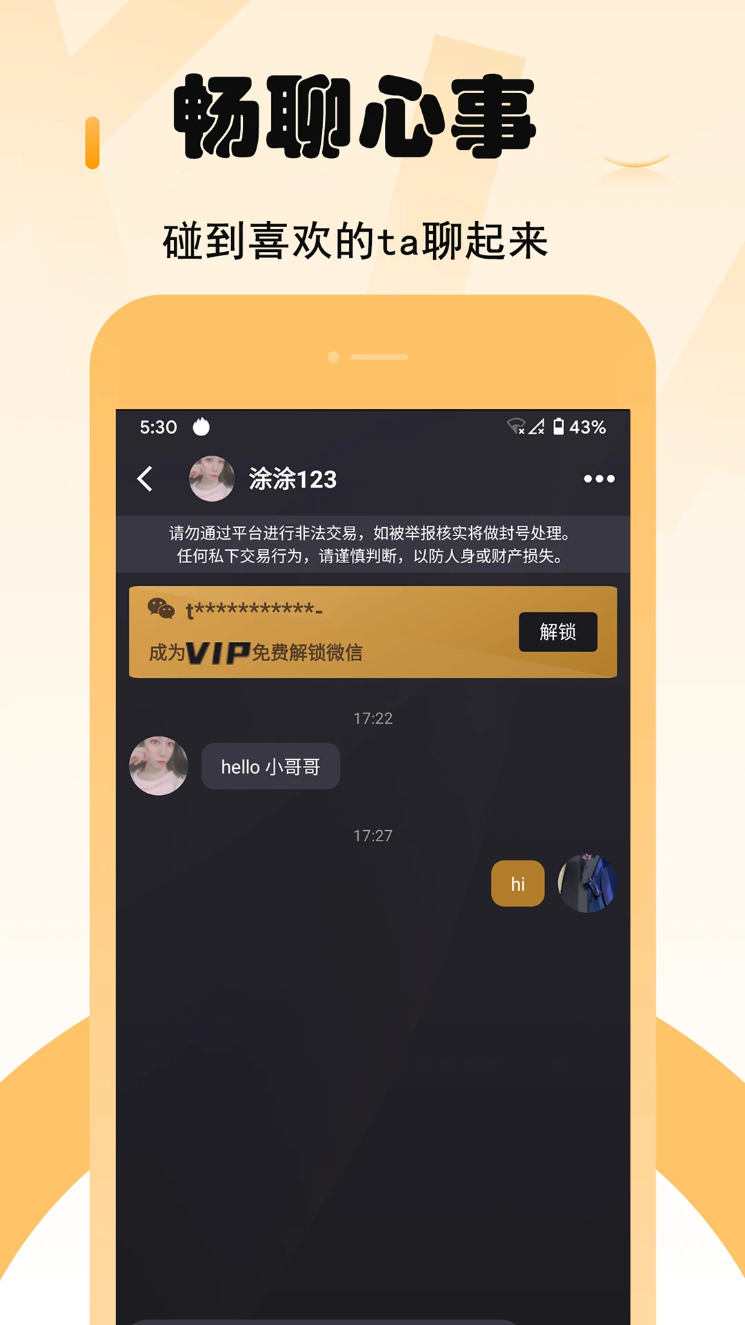 即时沟通功能让社交更便捷。当遇见心动的对象时,您可以立即发起聊天,与志同道合的朋友展开畅谈。平台支持多种沟通方式,让交流更加自然流畅。无论是文字、语音还是视频,都能帮助您快速打开话匣子,拉近彼此的距离。在小圈,每一次对话都可能开启一段美好的缘分。
