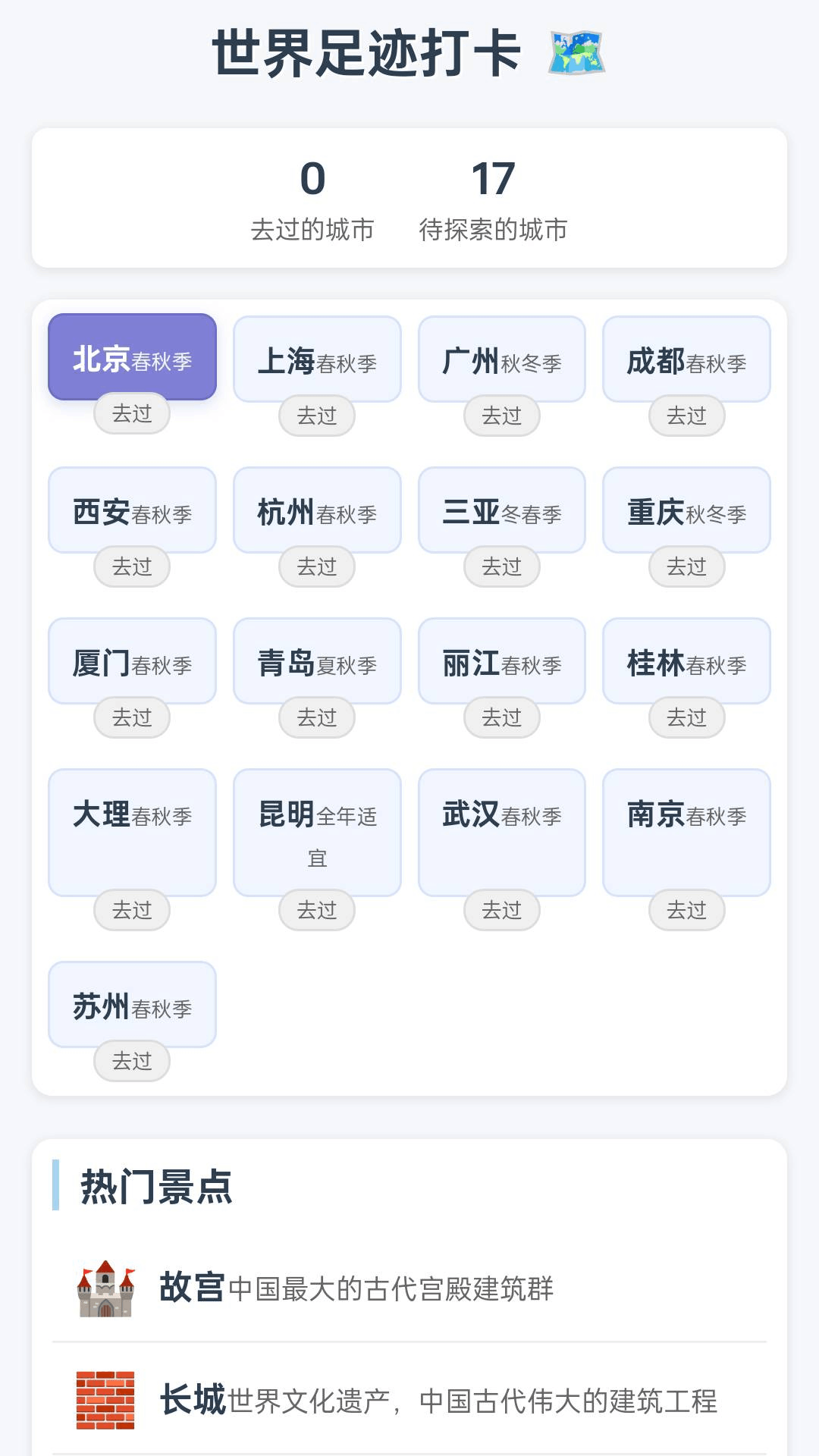 推荐热门景点,如故宫、长城,帮助用户了解各地著名景点以及记录用户去过的城市数量。系统会根据用户的地理位置智能推荐周边值得探索的景点和路线。用户可以通过拍照打卡的方式记录每个到访地点,自动生成精美的足迹地图。应用还提供景点详细介绍、最佳游览时间和实用小贴士,让用户的每一次探索都更加深入和有意义。支持与好友分享旅行见闻,互相激励探索更多地方。