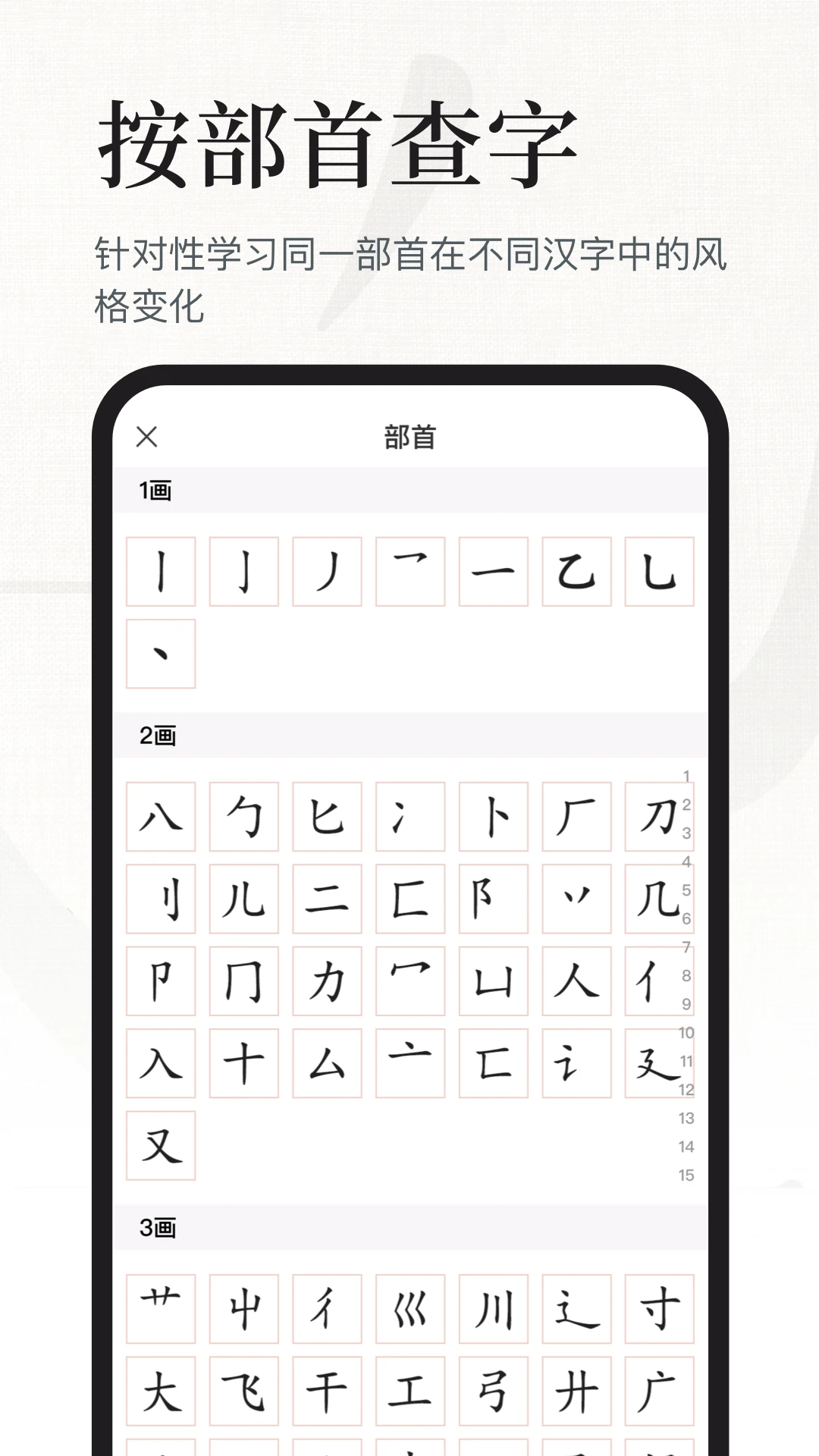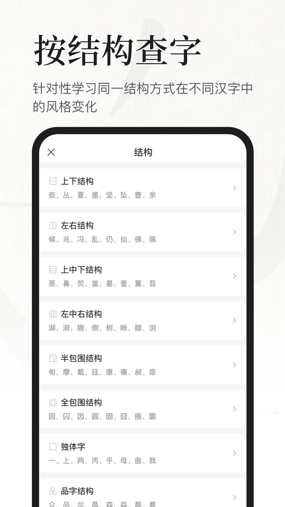 字典工具功能强大而全面:多字查询功能支持同时查询多个汉字,查询结果可通过手势左右滑动浏览,让创作灵感源源不断;部首查字功能让您能针对性学习同一部首在不同汉字中的风格变化;结构查字功能则专注于同一结构方式在不同汉字中的表现差异。此外,您还可以按书体、朝代、书家进行结果筛选,或按热度、朝代、笔画、拼音等多种方式排序。拍照对比功能更是临帖利器,支持临帖对比、重叠对比、双钩对比等多种模式,帮助您精准把握字形结构。