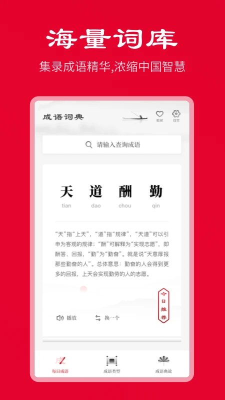 每日学习计划:特别设计的"每日一成语"功能,每天为用户推荐一个精选成语进行学习,通过日积月累的方式,帮助用户循序渐进地扩大成语储备量,培养良好的学习习惯。