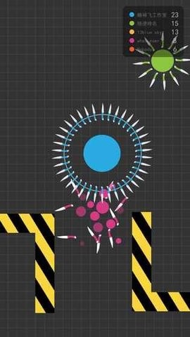 玩家不断的拾取新的飞刀,用飞刀来扩大自身的范围,这样能在游戏占据很大的优势,当自身的体积变得越来越大时,你不仅拥有自保的的能力,还能击杀其他玩家,让自己变得更加强大。尖刺破坏阵形是面对强敌时的最后一搏,被敌人包围,可以使用这个方法反败为胜,为了争夺第一名的位置,玩家们将要更加快速的操作圆圈移动,努力收集飞刀。建议在后期保持移动,避免成为其他玩家的集火目标,同时寻找机会偷袭落单的对手。