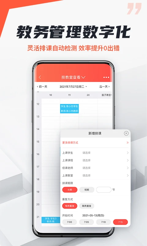 系统实现家校信息实时互通,自动推送上课提醒、考勤通知、课程调整等重要信息,让家长随时掌握教学动态。支持家长在线完成报名选班、购课约课、请假申请等操作,提供7×24小时不间断的便捷服务。此外还设有家校互动社区,促进教师与家长之间的深度交流,共同关注学生成长。