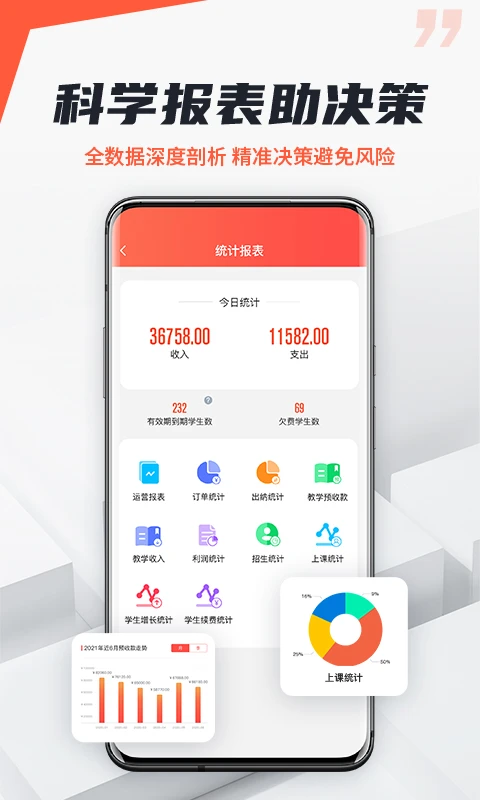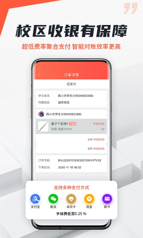 系统配备智能移动收银解决方案,支持扫码聚合支付,结算手续费低至0.25%,大幅降低机构运营成本。学员充值、支付、退课转课等操作全部实现自动化处理,系统自动统计核销并生成详细业务流水,确保账目清晰可追溯。此外还提供多维度的财务分析报表,帮助机构实时掌握经营状况。