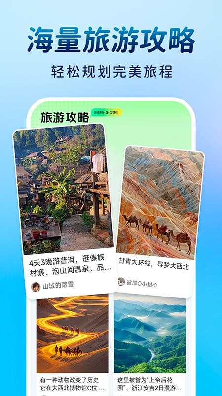 详细的旅游攻略都可实时查看,便捷查看攻略,规划自己的行程,轻松出行。平台邀请了数百位旅行达人和专业编辑团队,共同打造覆盖全球500多个热门目的地的深度攻略,包含景点推荐、交通指南、美食地图等实用信息,帮助用户轻松规划完美旅程。