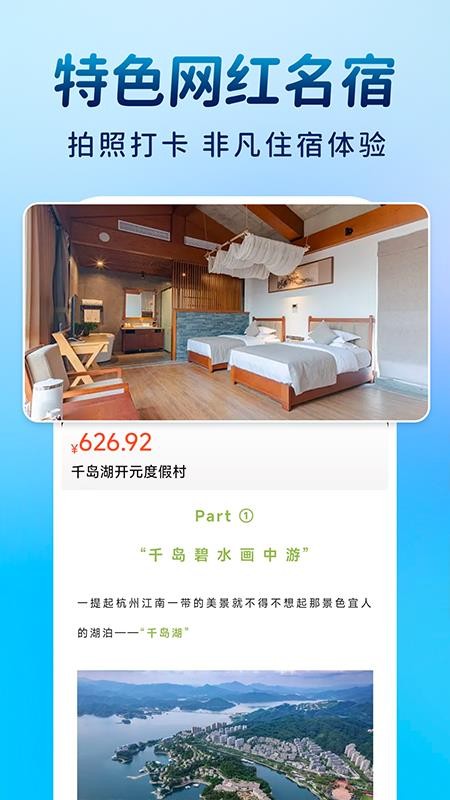 还为用户提供了线上的特色网红民宿,用户可以对网红民宿来进行拍照打卡,享受优质的住宿体验。这些民宿都经过严格筛选,涵盖森林树屋、海边别墅、古城院落等多种风格,每间民宿都配有专业摄影师拍摄的实景照片,让用户足不出户就能感受民宿魅力。