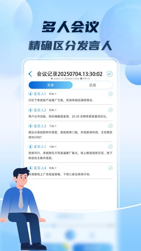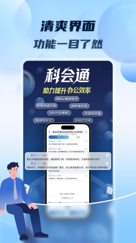 这款软件最突出的特点就是其智能化的会议记录功能。用户可以通过多种方式快速记录会议内容,包括实时录音、文字输入等。系统会自动识别不同发言人的声音,准确区分每位参与者的发言内容,并实时转写成文字。不仅如此,科会通还能智能分析会议内容,自动提取关键信息,生成简明扼要的会议摘要,帮助用户快速掌握会议重点,大大节省了后期整理的时间。