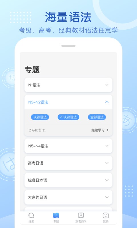 科学分类整理N1-N5各级别语法,同时针对高考日语、日语听力、口语表达等专项需求提供针对性学习内容,满足不同学习目标。