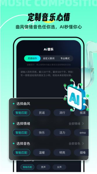 AIApp是一款革命性的智能音乐创作工具,它通过先进的AI技术彻底改变了传统音乐制作方式。无论您是毫无音乐基础的新手,还是追求创作自由的音乐爱好者,这款应用都能满足您的需求。AIApp的核心优势在于其强大的智能生成系统,用户只需输入创作主题,选择喜欢的曲风、风格、音色和人声类型,AI就能在瞬间创作出完整的音乐作品。特别值得一提的是,应用还提供了专业级的自定义模式,允许用户自由编写歌词,精心设计前奏、主歌、副歌和尾奏的每个细节,让创作过程既简单又充满无限可能。