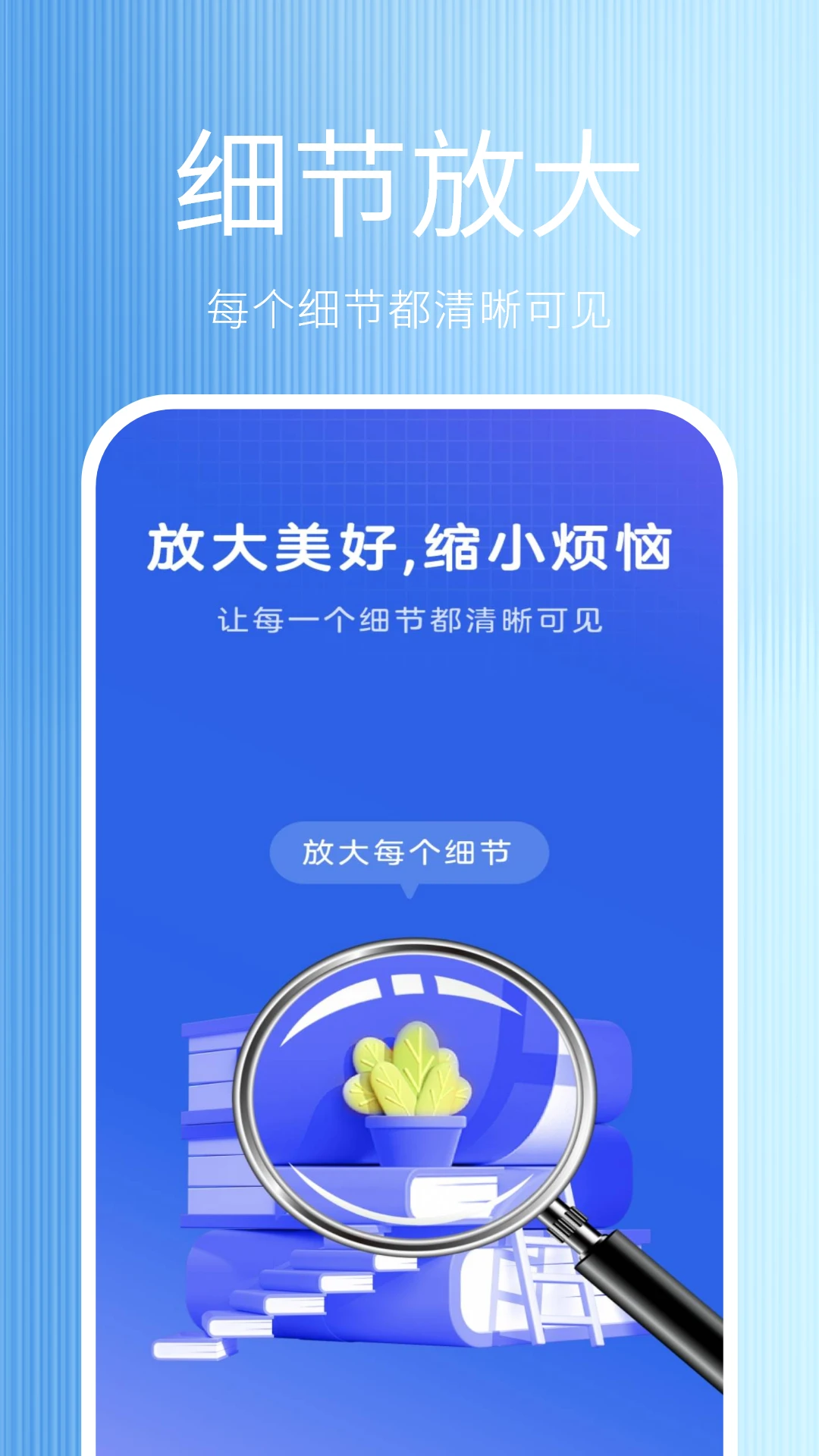 放大镜APP将传统放大镜的功能完美移植到手机上,只需一键即可快速启动,操作便捷,界面设计简洁明了。无论是阅读微小文字,还是观察生活中的细微之处,这款多功能放大镜都能轻松应对。它特别适合近视、老花人群,帮助他们摆脱视力困扰,重新发现世界的精彩细节。高清放大的效果让每一个字、每一处画面都清晰可见,是日常生活不可或缺的实用工具。