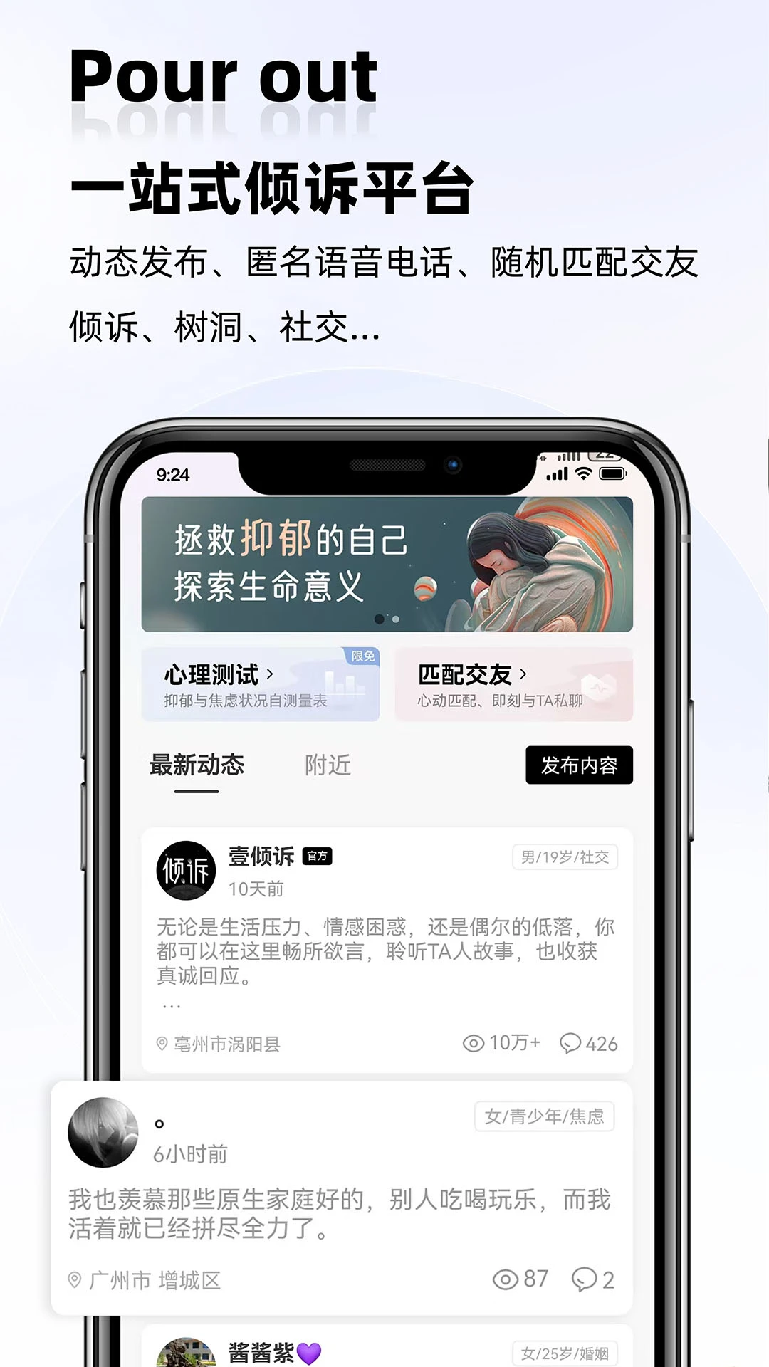 壹倾诉是一款专注于情感交流与心理健康的社交应用,为用户提供安全、私密的倾诉空间和多样化的社交功能。在这里,你可以通过匿名语音倾诉功能畅所欲言,无需担心身份暴露,尽情释放内心压力;也可以选择匿名文字倾诉,用文字记录心情,获得他人的理解与支持。平台还提供智能匹配交友服务,根据你的兴趣和需求为你推荐志同道合的伙伴,让你轻松找到能倾听心声的朋友。
