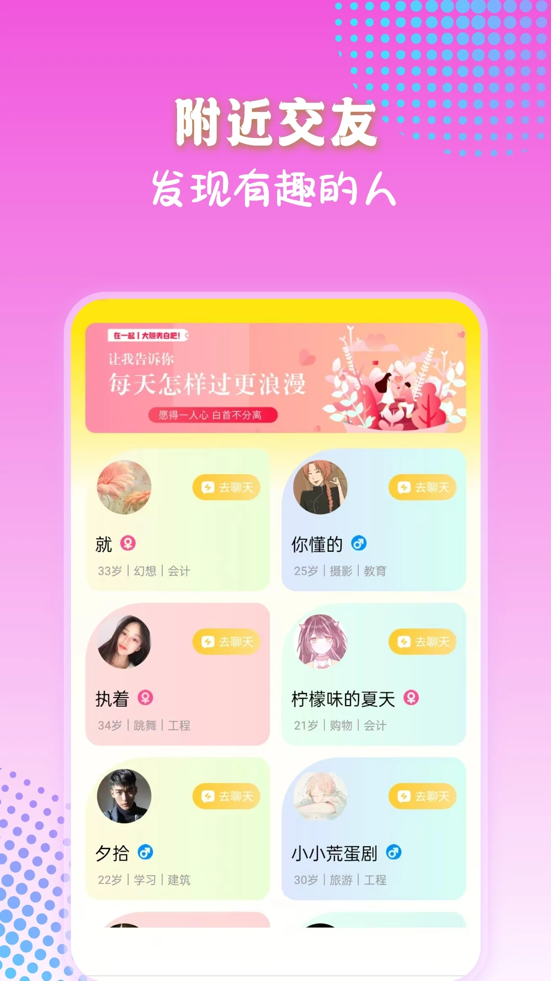 智能邂逅功能让相遇变得如此简单!基于先进的匹配算法,系统能精准识别你的兴趣偏好和性格特点,一键为你推荐最合适的聊天对象。告别繁琐的筛选过程,省去尴尬的破冰环节,直接开启轻松愉快的私密对话。无论是寻找知心好友还是期待浪漫邂逅,智能邂逅都能帮你找到那个最懂你的人,让相处的每一刻都自然流畅、充满惊喜。