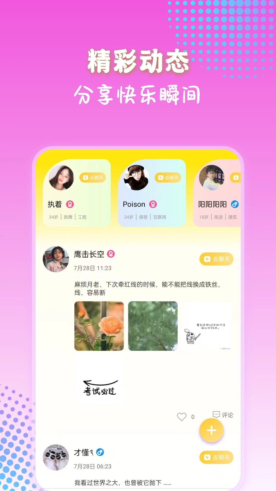 动态分享功能让你可以随时记录生活的精彩瞬间。无论是街头偶遇的可爱猫咪,还是亲手烹制的美味佳肴,亦或是突然涌上心头的感悟思考,都可以在这里留下印记。你可以畅所欲言地吐槽工作的小烦恼,毫无保留地分享生活中的小确幸,或是大胆表达那些藏在心底的热爱与追求。在这里,每一句真诚的表达都能找到懂你的听众,每一个平凡的日子都能因为分享而变得特别。