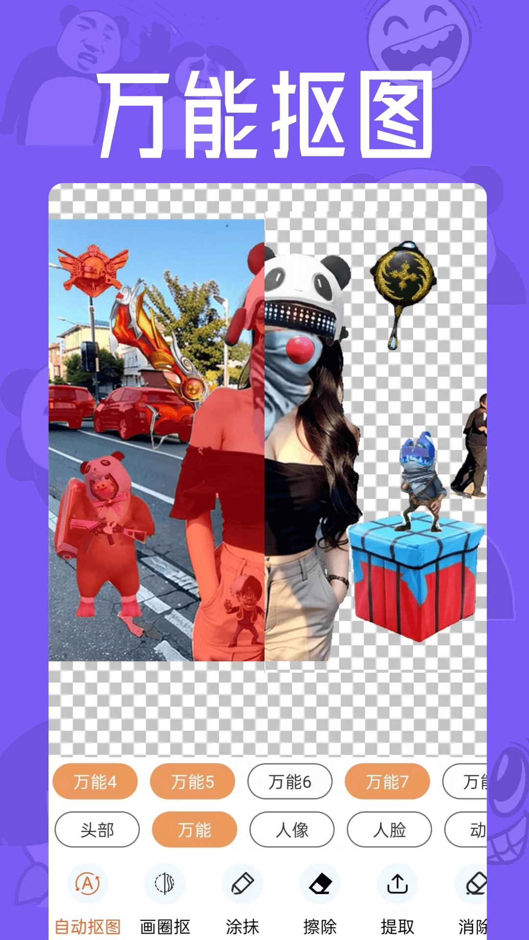 【万能抠图】不仅限于人像处理,这款软件的抠图功能堪称全能。无论是可爱的宠物猫狗,还是眼镜、汽车、武器等各类物品,都能被完美抠出。强大的边缘处理算法确保抠图效果自然流畅,为创意表达提供无限可能。