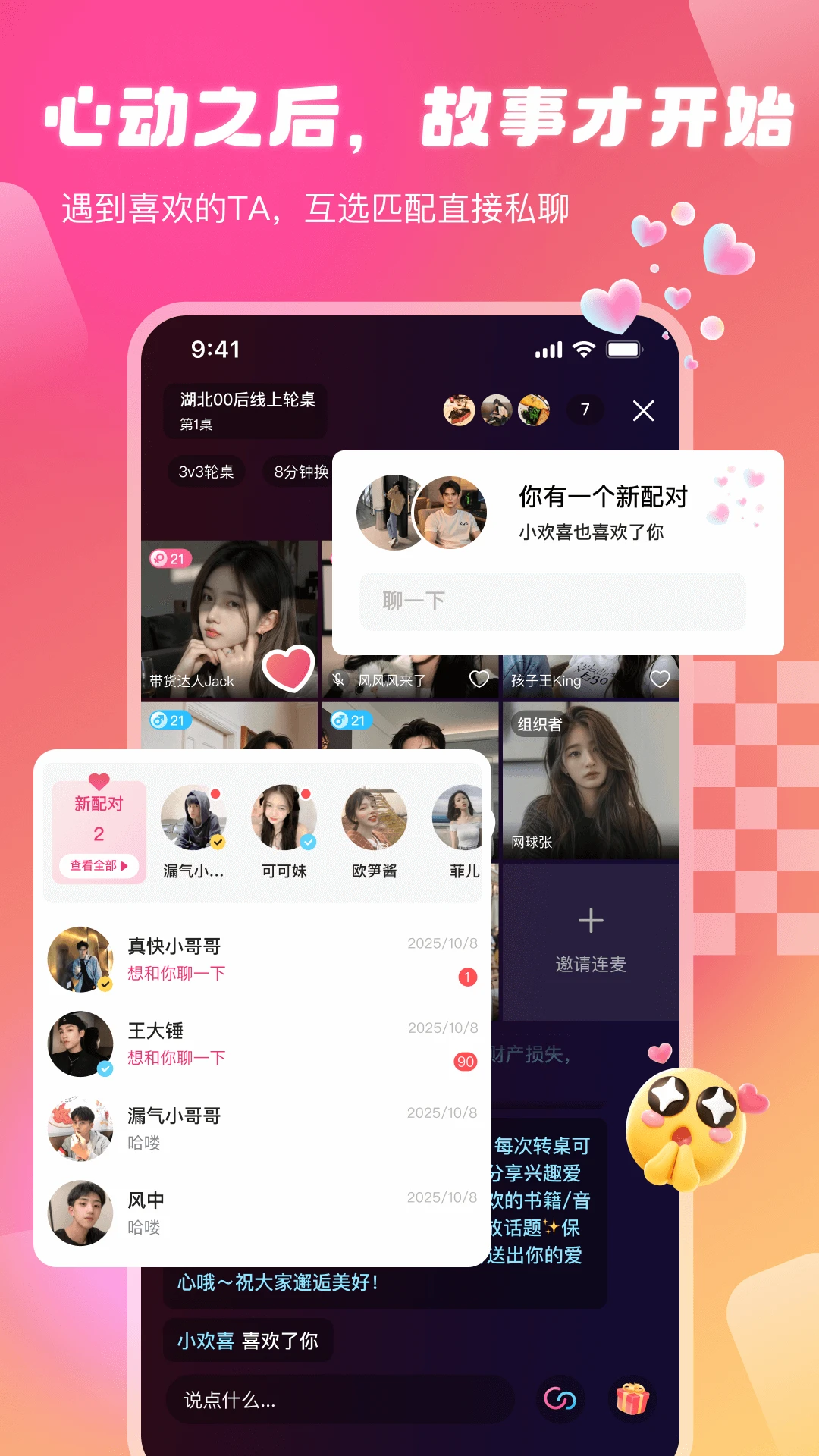 创建或加入一个主题相亲直播间,与多位优质嘉宾线上"面对面"交流。每个房间都设有特定主题,确保参与者兴趣相投。8分钟的限时交流既保持新鲜感又提高效率,精心设计的破冰话题帮助你们快速拉近距离。在轻松愉悦的氛围中,你可以尽情展示真实的自我,发现志同道合的伙伴。