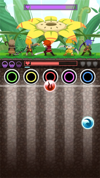 进入战斗场景后,玩家需要通过手指滑动将法力珠子分配给对应的勇者角色;当勇者集满所需法力后,就能释放强大的专属技能对敌人造成巨额伤害;
