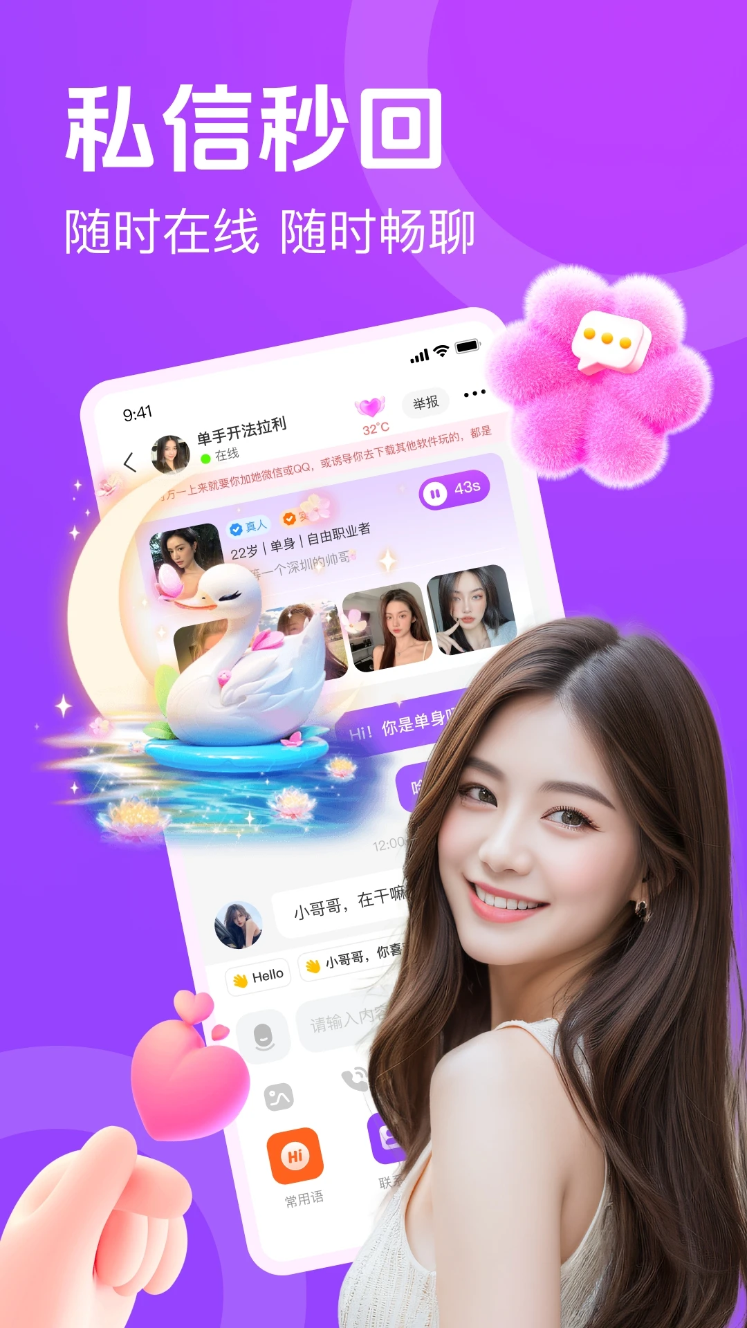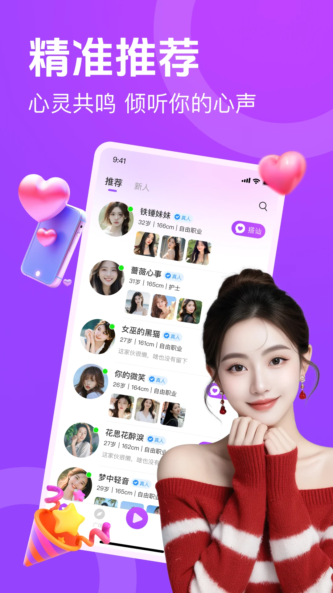 附近速配闪聊是一款集语音视频聊天、动态分享和真人社交于一体的创新社交应用,致力于为用户打造真实、有趣、高效的互动体验。无论你是想结识新朋友、寻找志同道合的伙伴,还是期待一段浪漫的邂逅,这里都能满足你的社交需求。